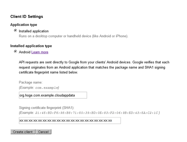アプリの識別子と、そのapkファイルを作成するのに使用した証明書の情報を入力します。 アプリの識別子は「org.hoge.com.example.cloudappdata」です。