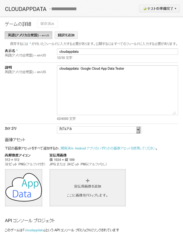 ユーザーに対してこのゲームサービスに表示される、ゲームの情報を入力します。現在は空のままで構いません。
