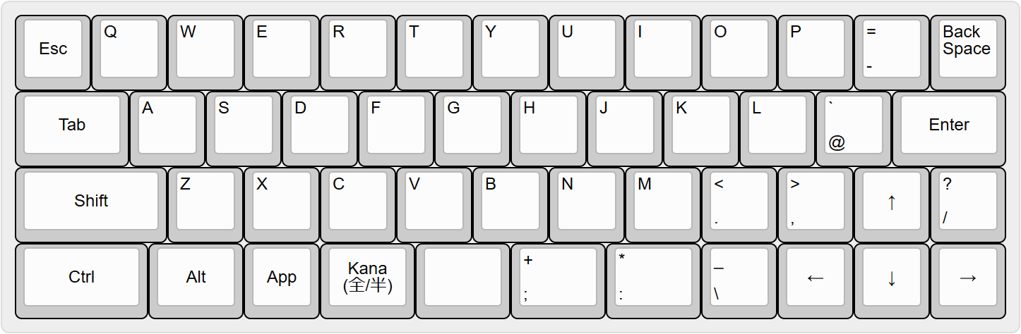 また、[App]キーだけを短期間押すことで、「アプリケーション」キーとして動作します。 | - [Esc]キーを押しながら他のキーを押すことで、Funcレイヤの文字を入力することができます。