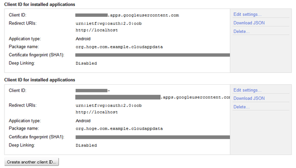 - 「Package name」にアプリ識別子名(org.hoge.com.example.cloudappdata)を、「Signing certificate fingerprint(SHA1)」に「apkファイルの署名に使用した証明書の情報」を入力します。
